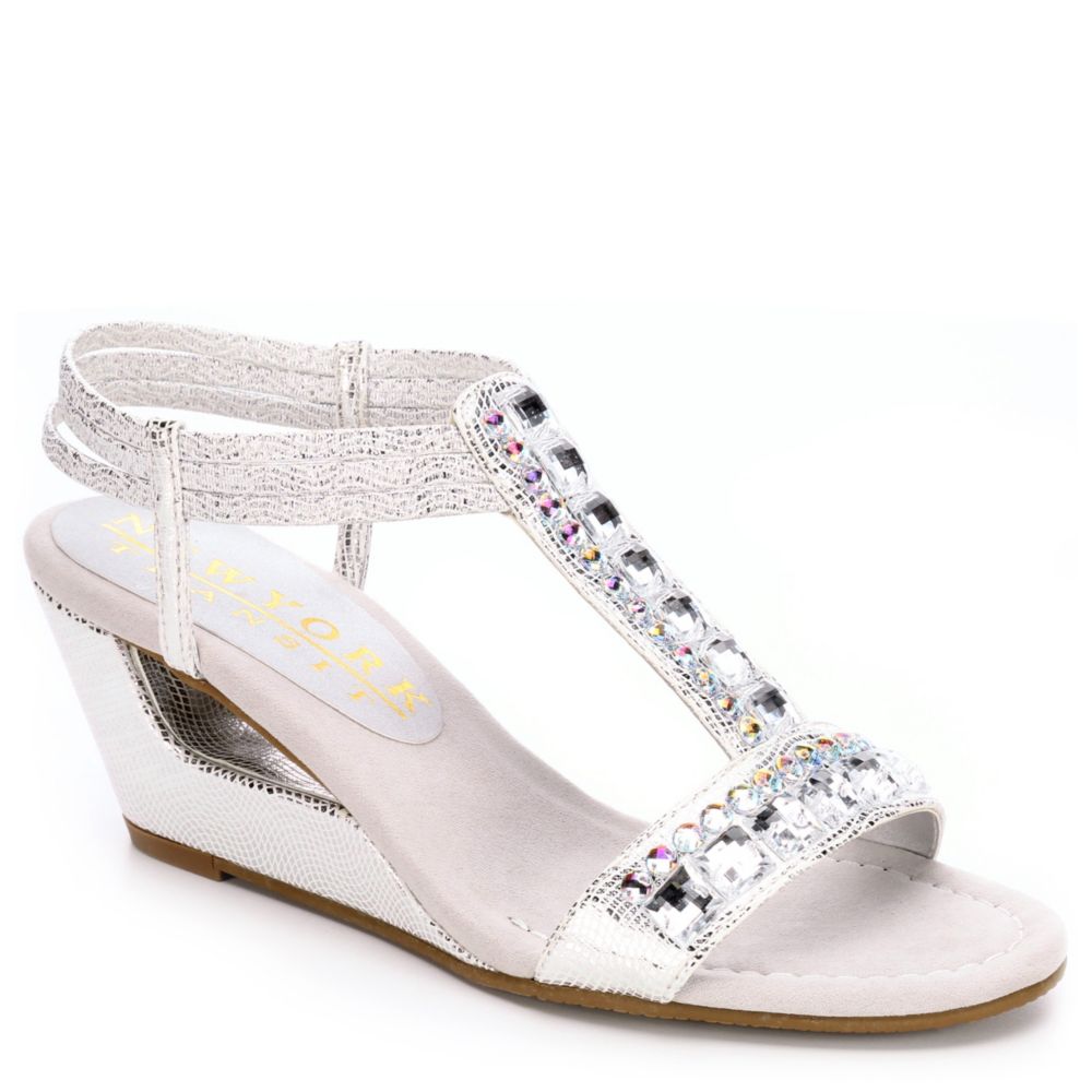 Polish off your evening attire in the Bold Move women's sandal from New York Transit. Gorgeous stones graze the front t-strap along with sparkly elastic straps. Last but not least is a cut-out wedge and snake texture detail.- Synthetic upper