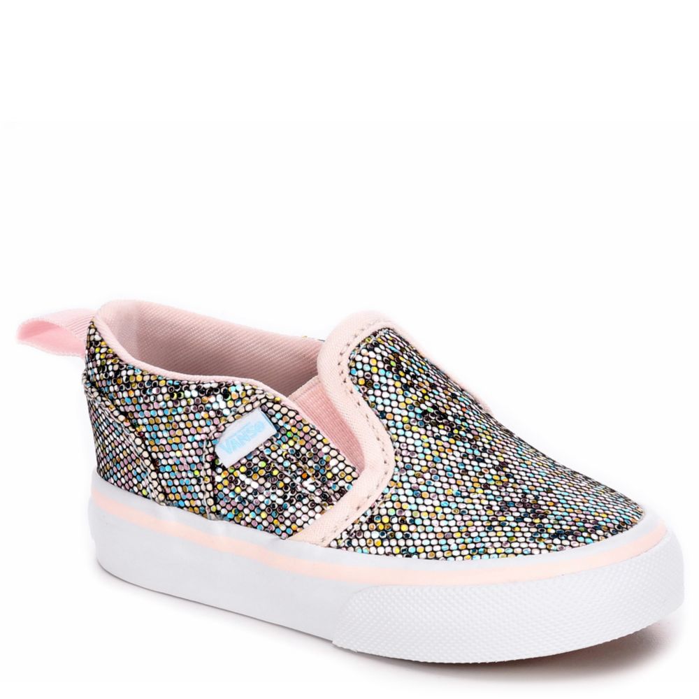 From its streamlined look to its slip-on design, the Vans Asher V Glitter girls' sneaker is laid back and authentically cool. The sparkly canvas upper offers a perfect fit for pure comfort and pretty contrasting trim.- Canvas upper