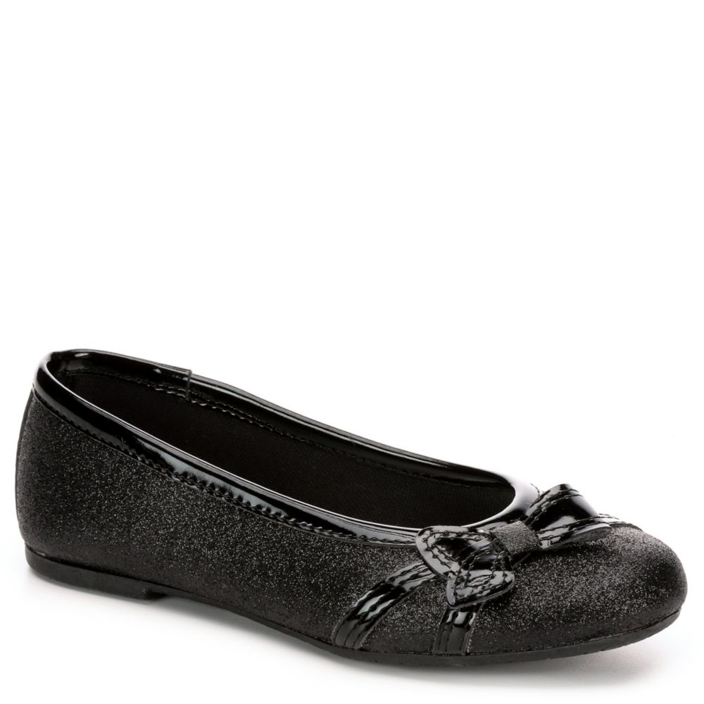 The glitter covered Paulina girls' flat from Rachel will have her smiling from ear to ear. This glitzy silhouette features a simple flat construction with easy on and off and sparkly overlay. Last but not least is an adorable patent bow.- Glitter upper
