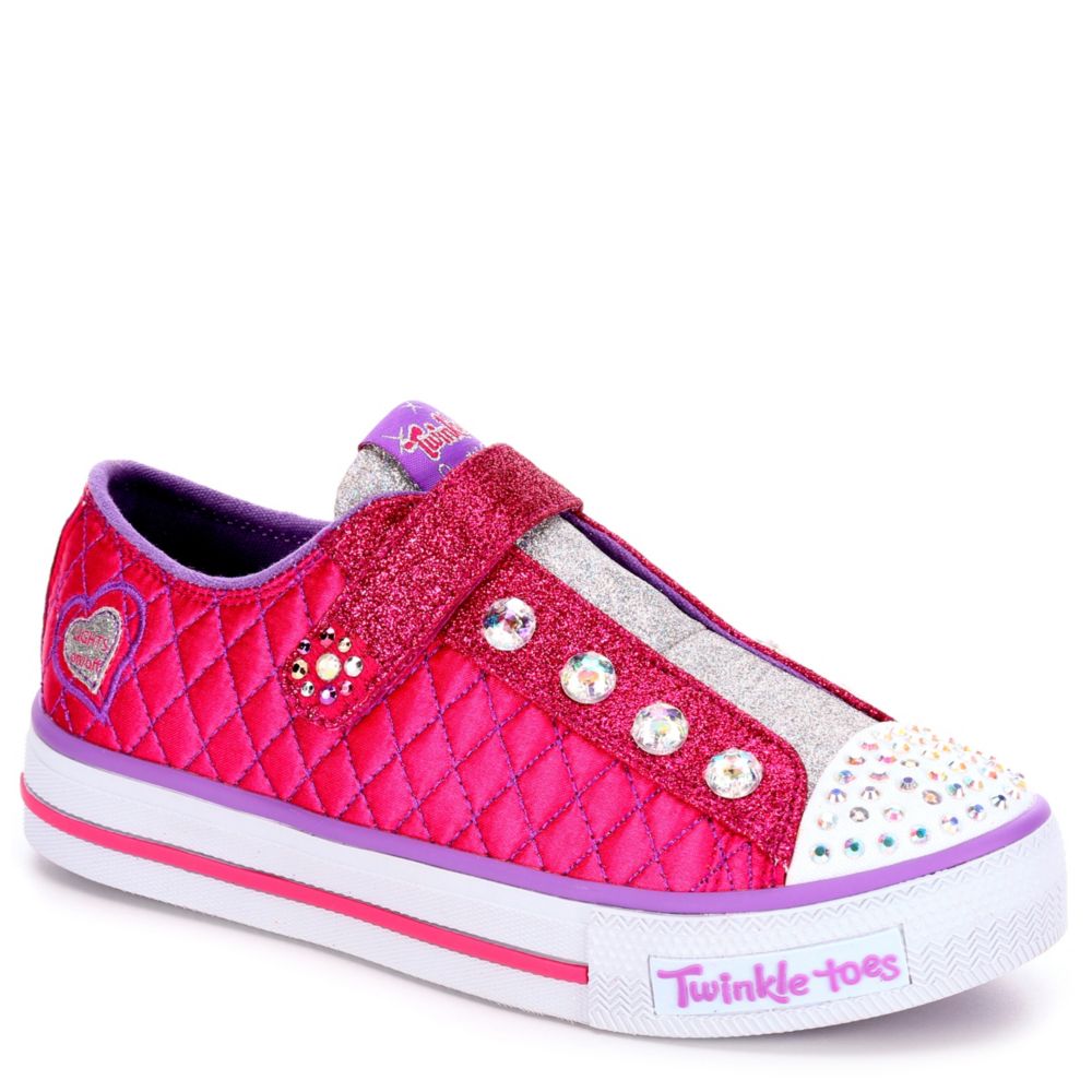 She'll sparkle from all sides in the Sparkly Jewels girls' sneaker from Skechers. A quilted fabric upper is contrasted by pretty glitter accents and gleaming stones. A light up toe cap will brighten up her day along with an easy hook-and-loop strap.- Quilted fabric upper