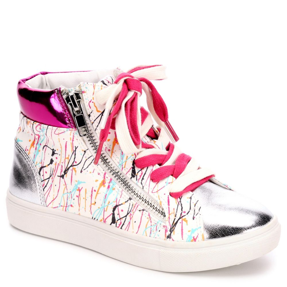 She'll be a rock n' roll diva in the JSpritzr girls' sneaker. This Steve Madden number features a multi color design with silver capped toe and multi-colored laces. A side zip creates an easy, fuss free fit.- Synthetic upper