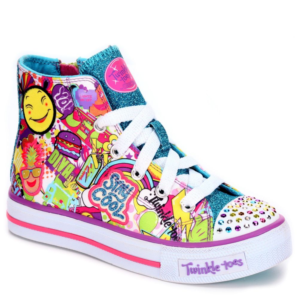 She'll sparkle from all sides in the Shuffles girls' high-top sneaker from Skechers. This glitzy number features a synthetic upper with colorful print, glitter tongue and adjustable laces. Last but not least is a light-up rubber toe to brighten every step.