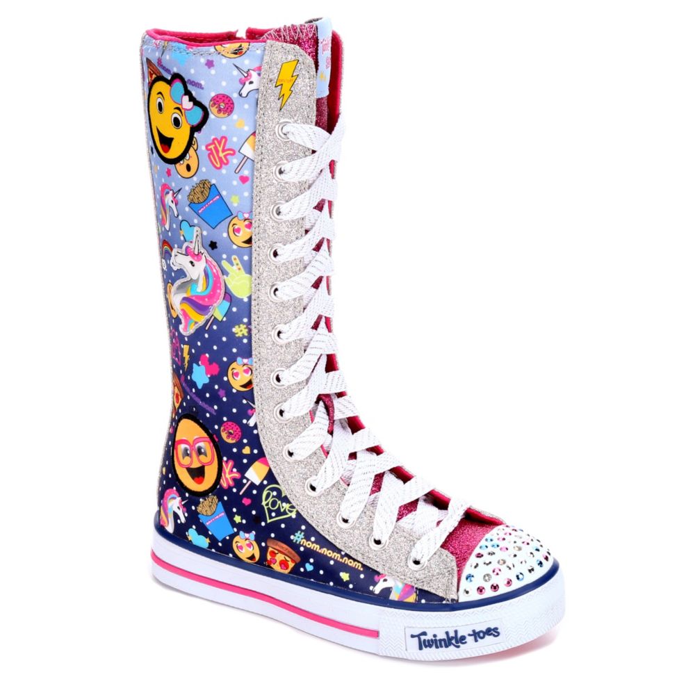 She'll sparkle from all sides in the Shuffles girls' super high-top sneaker from Skechers. This glitzy number features a synthetic upper with colorful print, glitter tongue and tall lace-up shaft. Last but not least is a light-up rubber toe to brighten every step.- Synthetic upper