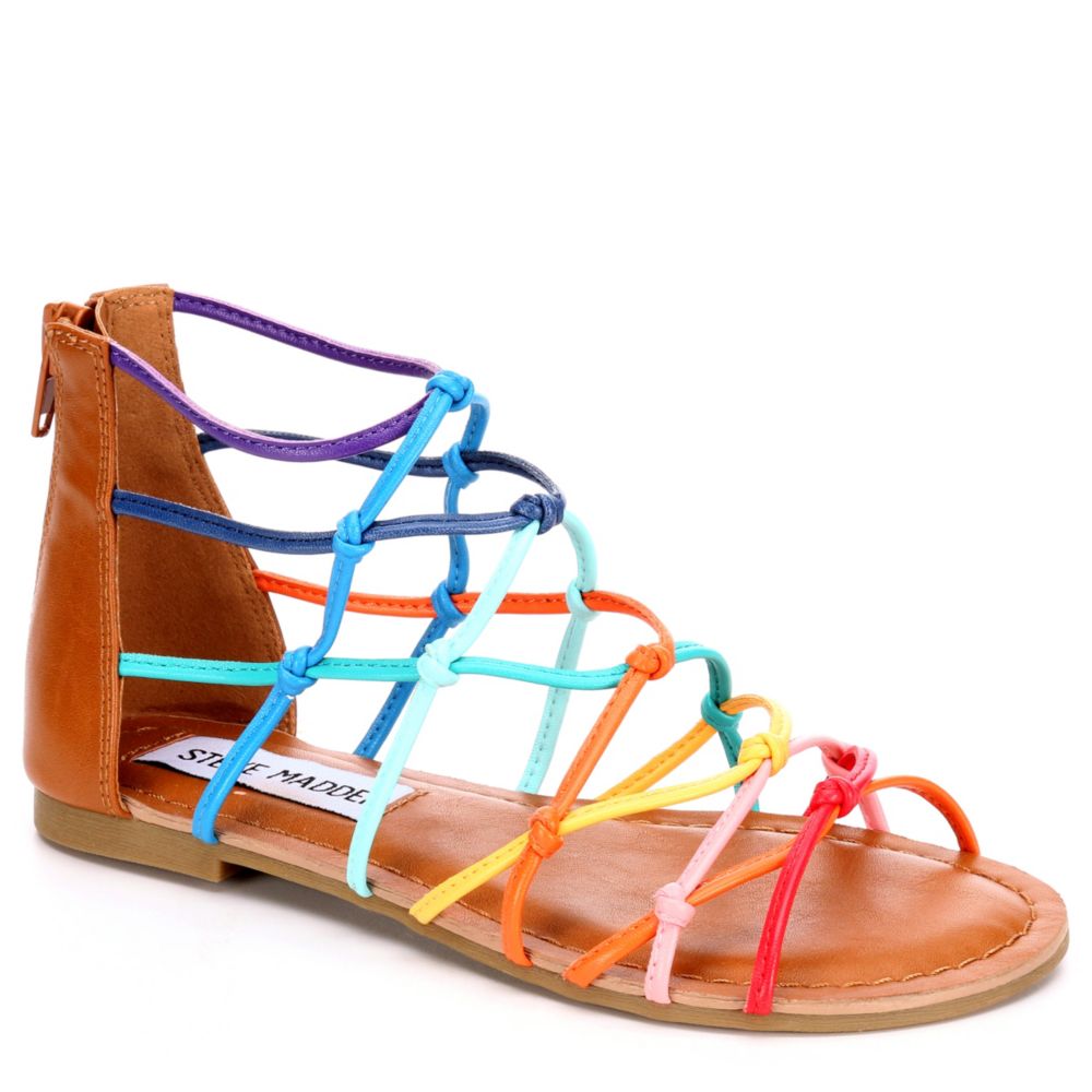 She'll be just as trendy as you in the Steve Madden Tmistic girls' sandal. This caged gladiator features a multi color upper with knotted straps and synthetic leather. It has a fuss free back zipper and comfortable flat design.- Faux leather upper