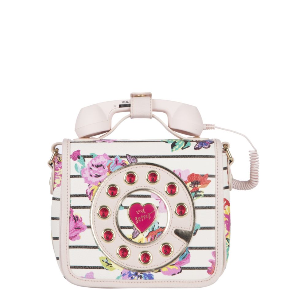 Fashion is your calling with the Betsey Johnson Phone Bag Crossbody. It has a square shape construction with pretty floral print and nautical stripes. A fun phone and cord accent adorns the top carry handle including a retro rotary detail at the front. The inside consists of soft fabric lining, three pockets and magnetic snap closure.- Synthetic material