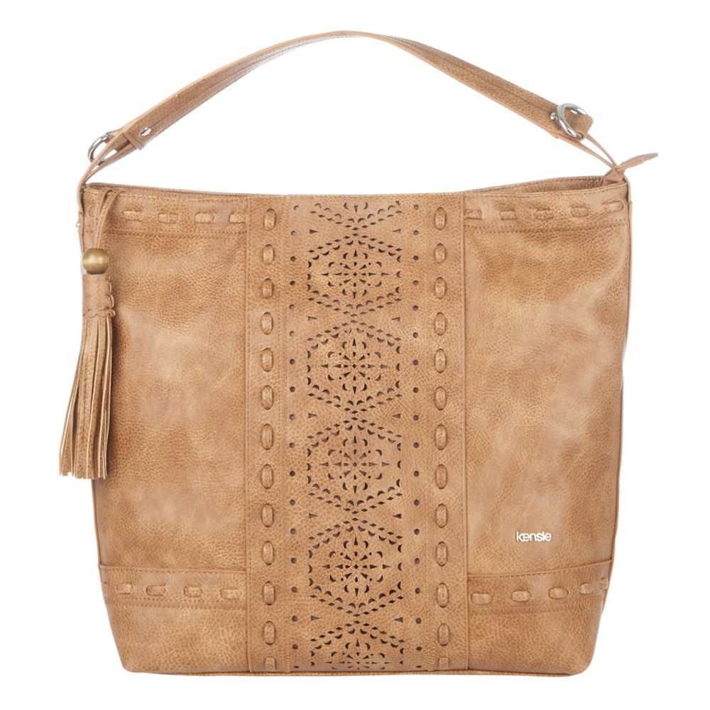 For a boho chic vibe, the Kensie Jakarta hobo does the trick! Patterned perforated faux leather details and zipper tassel give it the trendy boho style you love. The spacious interior features 3 slip pockets, 1cell phone pocket and a zip pocket.- Synthetic
